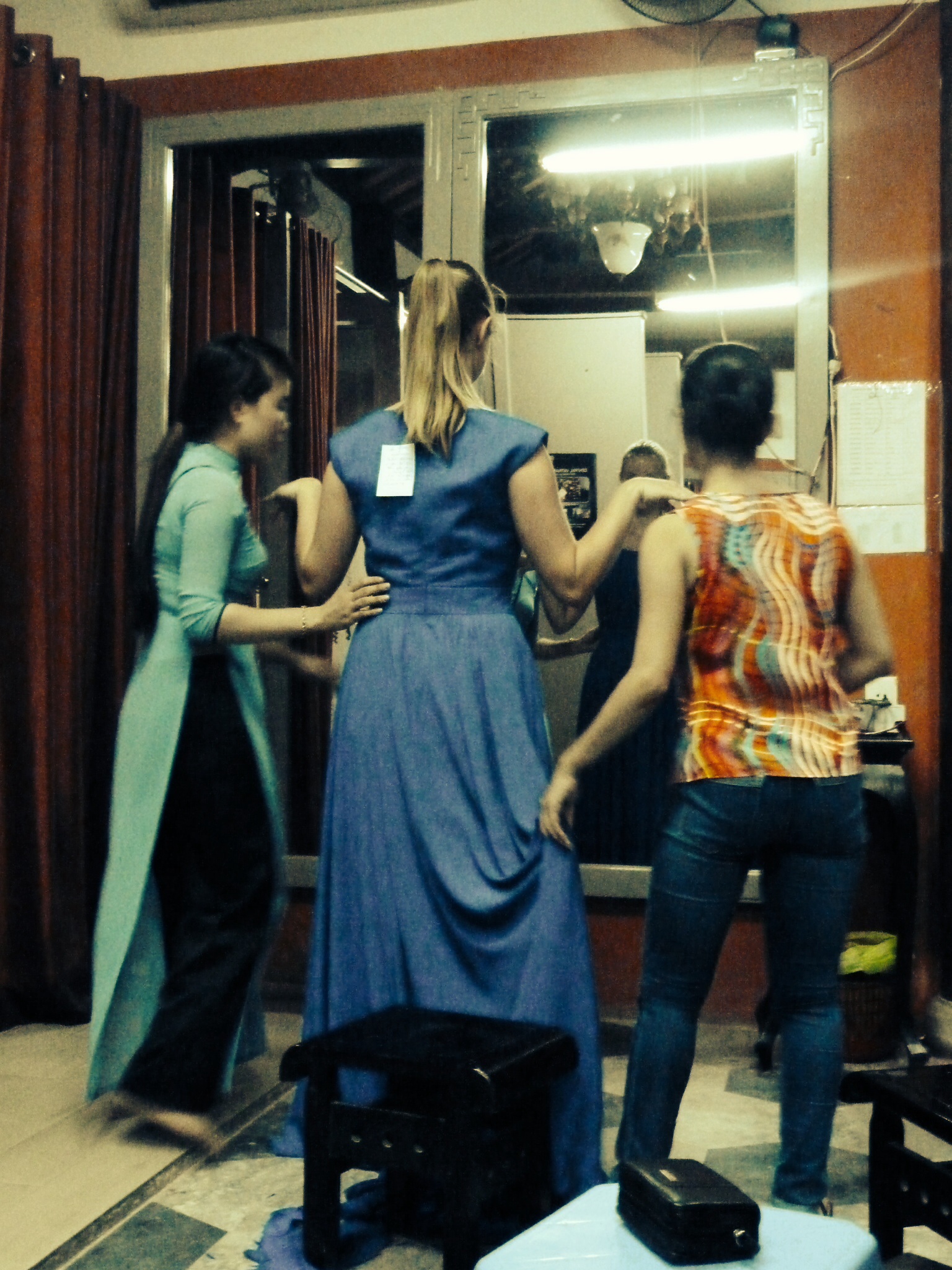 Es hat genau fünf Minuten gedauert, bis wir mit staunenden Augen auf den Sesseln inmitten der Schneiderei saßen und Prospekte wälzten, um uns die schönste Robe auszusuchen. G.s Gesicht hat eine äußerst angeregte rote Farbe angenommen und sie nimmt sich immerhin drei Sekunden Zeit, um ihren Blick von den bunten Seiten zu lösen: „Das ist ja ein Traumland“, haucht sie entzückt. Ich hingegen bin verstummt weil ich immer noch nicht fassen kann, wie sehr ich scheinbar ein herrliches Abendkleid benötige. Zumindest fühlt es sich genau in diesem Moment so an. Am Ende entscheiden wir uns für Kleider, die den royalen Outfits von Herzogin Kate ähneln (ja, drunter machen wirs nicht…). Bei den Damen im Verkauf löst das wohlwollende Anerkennung aus. „Das bestellen sich im Moment fast alle“, erklärt Mai Ling. Naja, was solls, wir sind zu selig, um uns darüber mehr Gedanken zu machen als nötig. Der Kate-Effekt hat uns halt auch erwischt.